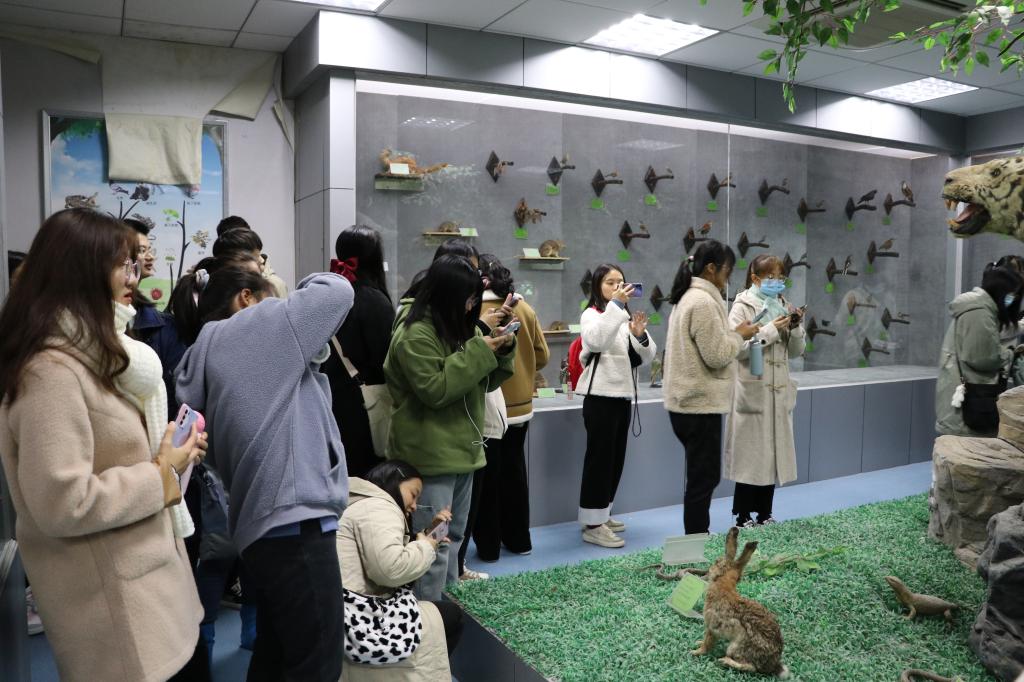 随后,参展学生跟随讲解员脚步参观动物标本馆,馆内展示了鸟、鱼、兽、两栖爬行和无脊椎动物等2800余件展品。其中鱼类展区的中华鲟吸引了许多同学驻足观看,旅游管理专业2020(2)班黄书欣正是其中一员,她说:“以前我对中华鲟的大小没有概念,见到标本后才发现它的体积比想象中大,这让我有了更直观的认识。”谈及参加活动的原因,新闻学2019(2)班陈思思说:“一次性能看到这么多种类的标本,感觉很震撼,在听讲解中也增加了对动植物的了解,开拓视野。”