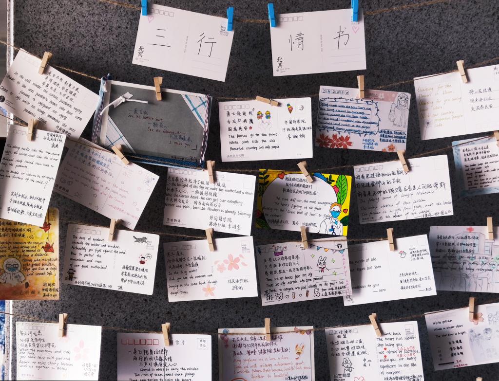 “为希望,为平安,为不久将来的万家灯火。”走入外国语学院,映入眼帘的便是张贴着“三行情书”优秀作品的海报,上面张贴的明信片诉尽了学生们对疫情期间医护工作者的感恩和赞美之情。