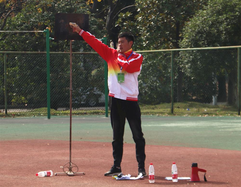早上六点半,当太阳才刚刚升起的时候,体育教育专业2018(2)班的张富磊早已身着红色裁判服,在南田径场上安放比赛器械,为当天的裁判工作做准备。