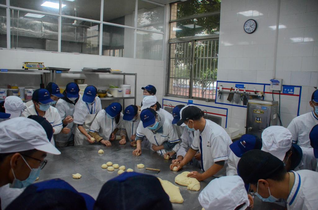 尽管刚开始操作有些手忙脚乱,但同学们学得十分认真。在面点师傅的指导和帮助下,他们逐渐熟练了起来,发挥自己的想象和创造力将面团揉成蜂蜜小面包、毛毛虫面包、肉松面包的生胚。在虎皮蛋糕的制作中,面点师傅向同学们介绍烘焙技巧以及虎皮纹路的形成原理,“烤箱上下加热有六七十度的温差,使表皮迅速收缩,才得以形成漂亮的纹路。”