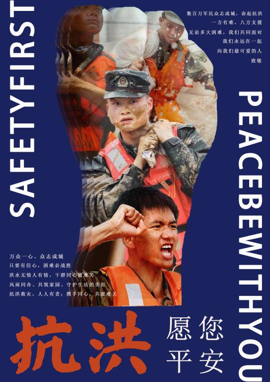 绘画作品《抗洪》中,解放军战士或紧抱孩童,或背伏老人,或搀扶伤员,他们蹚着过膝的积水把人民群众护送到安全的地方。“这是我看完新闻报道中最想描摹的场景。” 美术学专业2017(3)班的潘思慧说,“正是因为有像解放军这样的英雄战士无私奉献和守护,我们才能克服一个个难关。我相信,只要我们每个人都做出一点努力,我们也一定很快赢得防洪抗汛的胜利。”