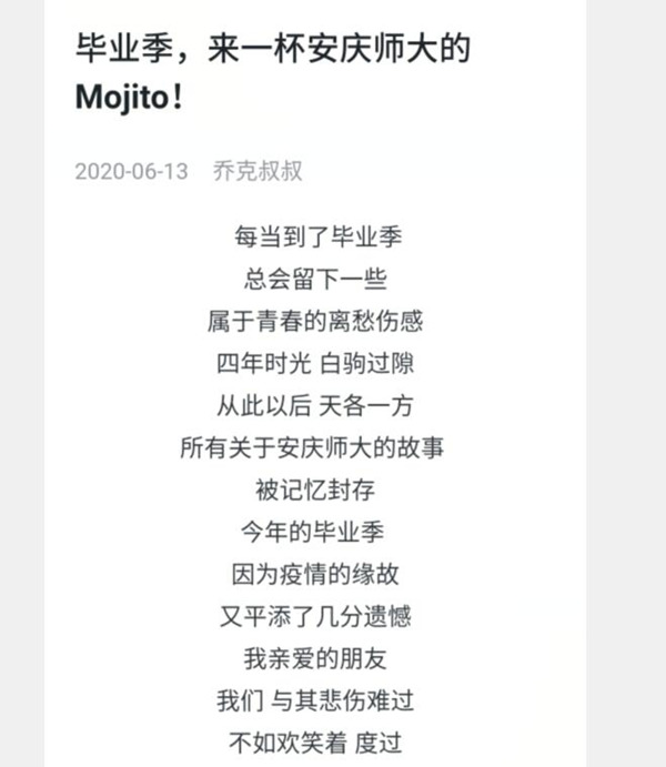 “最让我印象深刻的节目就是这个小品,吴尽哲的表演表达出一种很强的人文关怀,传递要以善意对待他人的行为品德。”2019级电信2班的谢海宁看完小品《那些年》时激动的说道。生活中的吴尽哲主动融入学生的生活圈,始终保持积极乐观的心态,在今日校园APP中创建名为“乔克叔叔”的个人电台,定期为学生推送励志歌曲和故事,临近毕业季,他改编的歌曲《毕业季,来一杯安庆师大的Mojito!》在个人电台发布以来,深受毕业生追捧。吴尽哲还主动组建考研交流群为学生提供在线辅导和答疑。