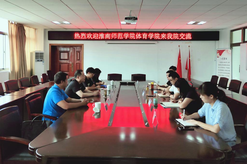 7月16日下午,淮南师范学院体育学院院长应力等一行七人,来beat365官网体育学院考察交流学校体育工作。体育学院院长章翔、副院长林秋菊、公共体育部和运动康复专业有关老师出席了交流座谈会。