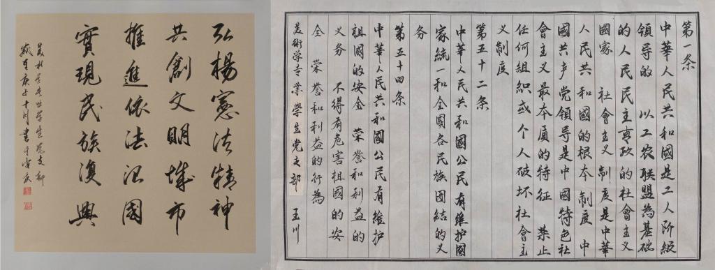 12月4日是国家宪法日,学生党员们自觉学习国家的根本法,主动增强宪法意识。为切实加强学习和弘扬宪法精神,12月5日,美术学院学生党支部开展了“写书法 学宪法”主题党日活动。