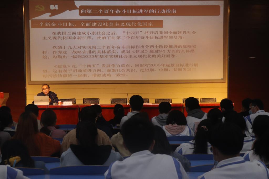 开班仪式结束后,金文斌为学院“青马班”学员和安庆一中师生代表作了“学习贯彻党的十九届五中全会精神”辅导报告。他从党的十九届五中全会的基本情况、重要意义、主要内容以及向第二个百年奋斗目标进军的行动指南等四个方面展开了解读。